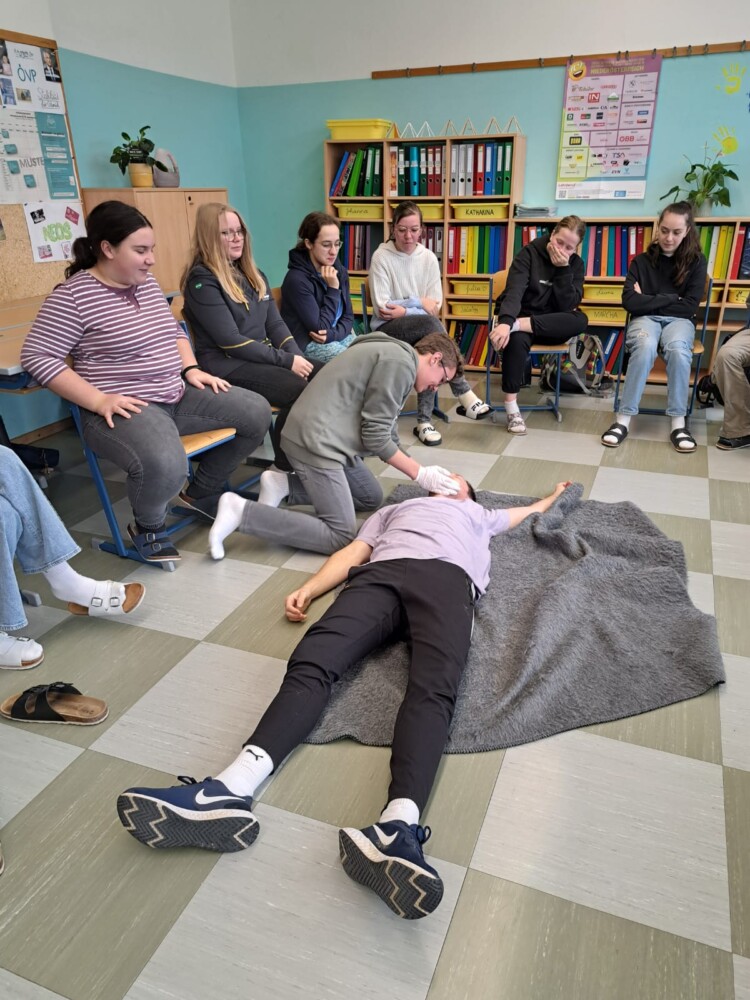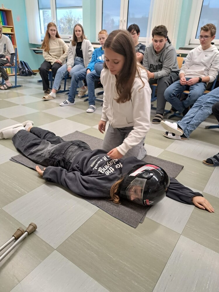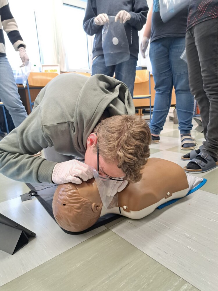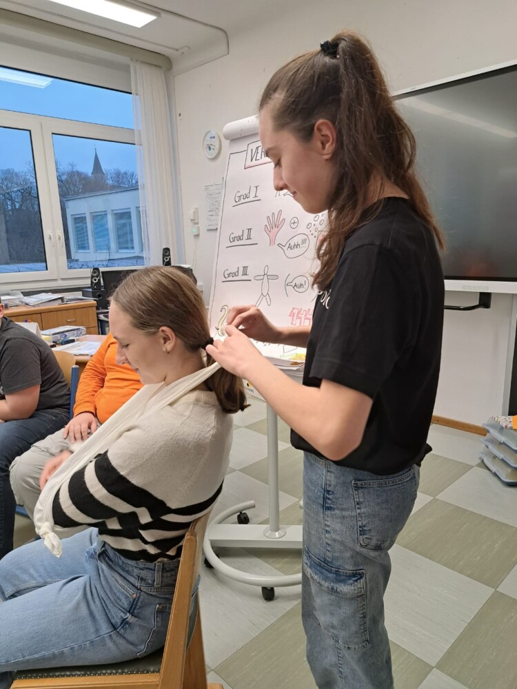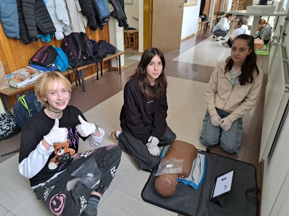 Die Jugendlichen lernten alles, was im Notfall wichtig ist – von der stabilen Seitenlage über die Herzdruckmassage bis hin zum sicheren Umgang mit einem Defibrillator. Dabei erlernten sie nicht nur die Theorie, sondern auch praktische Übungen kamen nicht zu kurz: Verbände wurden angelegt, simulierte Notfallsituationen bewältigt und der richtige Ablauf der Rettungskette trainiert.