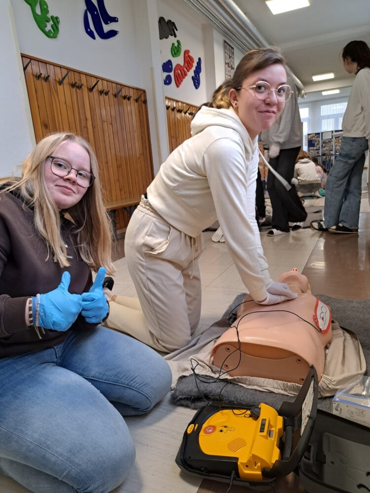 Neben den praktischen Übungen gestalteten die Schülerinnen und Schüler auch ein eigenes Erste-Hilfe-Portfolio. Darin wurden die wichtigsten Informationen wie die Basismaßnahmen, die Notrufnummern und konkrete Handlungsanleitungen für einen selbst gewählten Notfall festgehalten. Ein Selfie mit dem nächst gelegenen Defibrillator durfte dabei auch nicht fehlen.